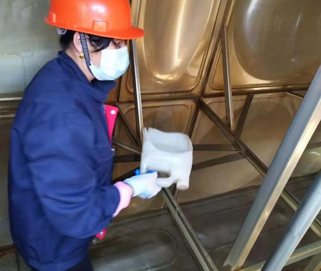 在清洗水箱的過(guò)程中,消毒人員須帶護(hù)眼鏡、口罩,如在水箱內(nèi)感到
